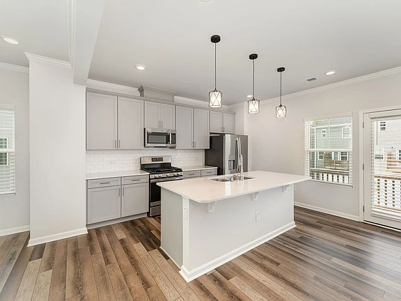 Welcome to this stunning end-unit townhome in the James Grove subdivision of West Cary! Boasting 4 bedrooms and 3.5 bathrooms, this home offers a perfect blend of comfort and style. The lower level features a two-car garage, a versatile bedroom, and a full bathroom. On the main level, enjoy an open floor plan with laminate flooring, an abundance of windows, and a modern kitchen equipped with quartz countertops, a large island, and a high-end LG three-door refrigerator. The kitchen flows seamlessly into the dining and living areas, with a deck off the back for outdoor enjoyment. The upper level hosts the primary suite with a walk-in closet and a luxurious ensuite bathroom with a walk-in shower and dual vanity. Two additional bedrooms, a full bathroom, and a laundry closet complete this level. With its contemporary design and prime location in West Cary, this townhome is ready to welcome you home!