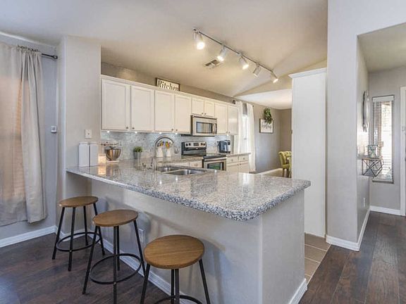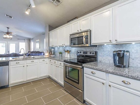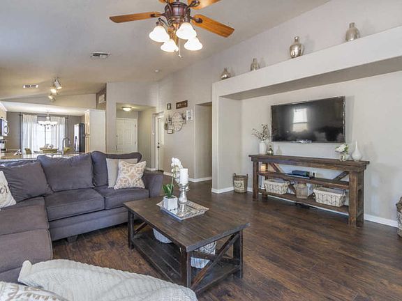 You'll love this BEAUTIFUL home with 4 bedrooms & 2 updated baths in 1580 SqFt. Great room floor plan with vaulted ceilings and a roomy eat-in kitchen. The kitchen has white cabinetry w/stainless hardware, granite countertops, marble backsplash & stainless appliances. The great room has lots of natural light, recessed media niche and french doors that lead out to the covered patio & large grass backyard w/additional pergola-covered patio & firepit w/built-in seating. This home backs a park, so no rear neighbors! The master bedroom has a bay window & private bath w/dual sink vanity, tub/shower combo & walk-in closet. Other features include new dark wood-laminate & tile floors, new paint, 2 car garage, RV gate, vaulted ceilings, & much more! See this home today!