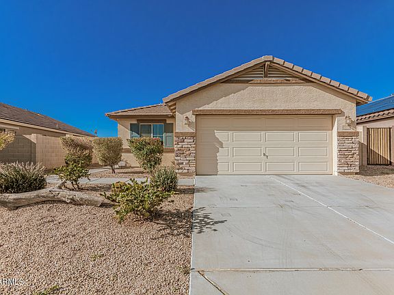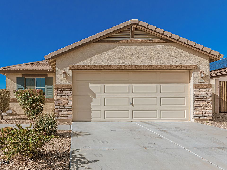 DON'T MISS OUT ON THIS OPPORTUNITY! A single-level residence w/stone accents on the facade and a 2-car garage is now on the market! Appreciate the gem's open layout showcasing vaulted ceilings, tile floors, an earth palette, and a great room. Practice your cooking skills in the kitchen featuring track lighting, oak cabinets w/crown moulding, a pantry, white appliances, plenty of counter space, patio access, and a center island w/a breakfast bar. Main bedroom includes a walk-in closet and a private bathroom. All bedrooms enjoy plush carpets and soothing paints. Turn the den into your workspace. Also, this beauty offers a covered patio, paver, and mountain views in the backyard. Solar installed to keep your bills reasonable in the heat! No neighbors to the east! Make this your dream home!