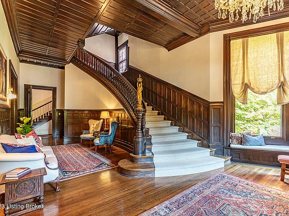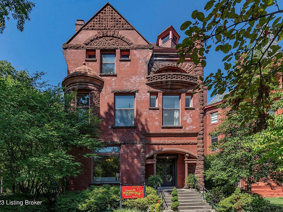 Welcome to one of Old Louisville's favorite victorian mansions. Currently operated as a profitable bed and breakfast, this property is an elegant blend of original architectural features and modern comforts. The grand foyer proudly showcases exquisitely restored original woodwork and the most impressive spiral staircase. To the left of the foyer is a living room with a large picture window overlooking fourth street. The spacious dining room is perfectly preserved, featuring an original fireplace and a stunning chandelier. Around the corner is a home office, large walk in pantry, and a modern coffee and drink bar. The kitchen has been fully updated with a large island, new cabinetry, and commercial grade appliances. Split between the second and third floors are six bedrooms all with updated, en suite bathrooms. The rooms are tastefully decorated and most have fireplaces. Outback of the main house is a massive covered porch overlooking a manicured courtyard. Find your way through the courtyard to the carriage house which showcases the same original charm and sophistication. This additional 2400 square foot has a galley style kitchen, open living area with room for dining and socializing. There are also three additional bedrooms and with ensuite bathrooms. The property has a detached two car garage and is located on a beautiful corner lot next to central park.