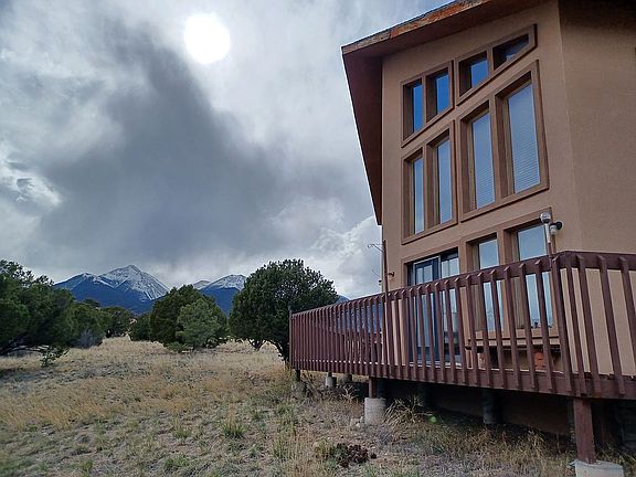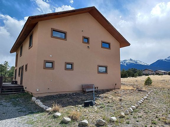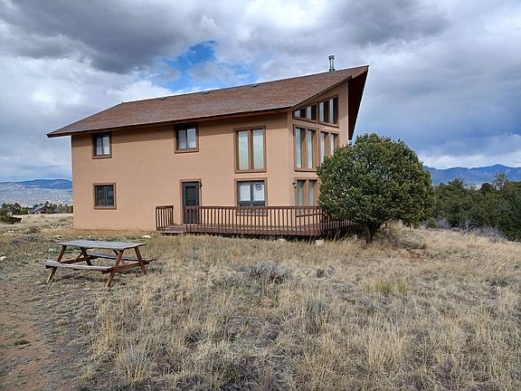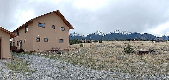 Brown stucco two story cubic design 75 yards off a county road at end of long driveway on two adjoining 2.5 acre lots. Very large master bath with tub separate from walk in shower and with double vanity. Three large walk-in closets. Second full bathroom with double vanity (2 sinks). Generous kitchen counter space. Open floor plan. Large bank of south facing windows gather solar heat in the winter. Cool cross ventilation in the summer. No other neighborhood homes closer than 100 yards. House on two lots, 2.5 acres each. Walking trails with benches. Unobstructed views of mountain ranges east and west. Wrap around deck. Separate two car garage with storage space and automatic door openers.