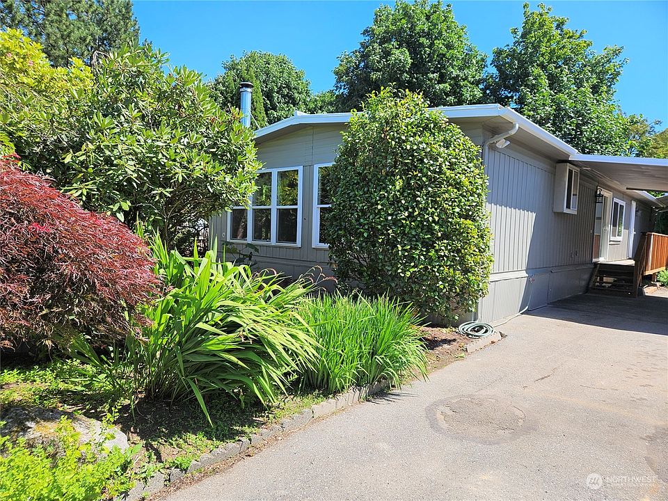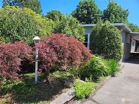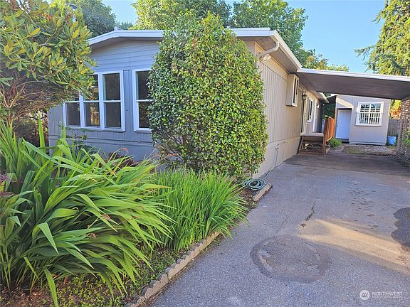 Lovely, remodeled, freshly painted home in popular 55+ park. Light filled formal dining room & a large living room with built-ins & a wood burning stove. New carpet and laminate hardwood floors. Off the spacious kitchen is a pantry, eating bar, and family room with ceiling fan. Huge primary bedroom features mirrored closet doors & adjoining luxurious full bath with soaking tub. Second bedroom’s full bath can also be accessed off hallway. Other amenities include newer double pane windows, large garden shed with new roof, an abundance of garden space with numerous raised garden beds and a cherry tree. Several decks, one covered with new carpet. Long driveway. Carport. Convenient location. Close to shopping, Boeing, freeways and bus routes.