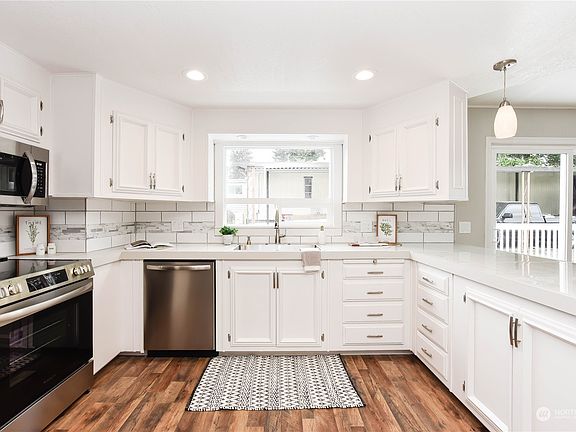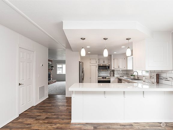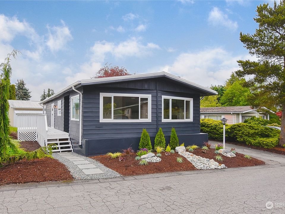 Experience luxury in this fully remodeled 2-bed, 2-bath home spanning 1,411 sq ft in a 55+ community. Revel in the warmth of a wood-burning fireplace in the living room, an array of windows for natural light, built in hutch w/ glass fronts, drawers & cabinet lighting. Chefs dream in sophisticated kitchen equipped w/ all new stainless steel appliances, tile countertops, under cabinet lighting & garden window. Dining room adjacent to kitchen w/ deck off slider. Primary suite w/ multiple closets, gorgeous bathroom w/ double sinks & soaking tub. Bath off second bedroom, accessible from hall as well - tiled shower w/ glass doors. Landscaped + storage shed. Space rent at $647.00 per mo, includes water, sewer, & trash. Schedule your tour today!