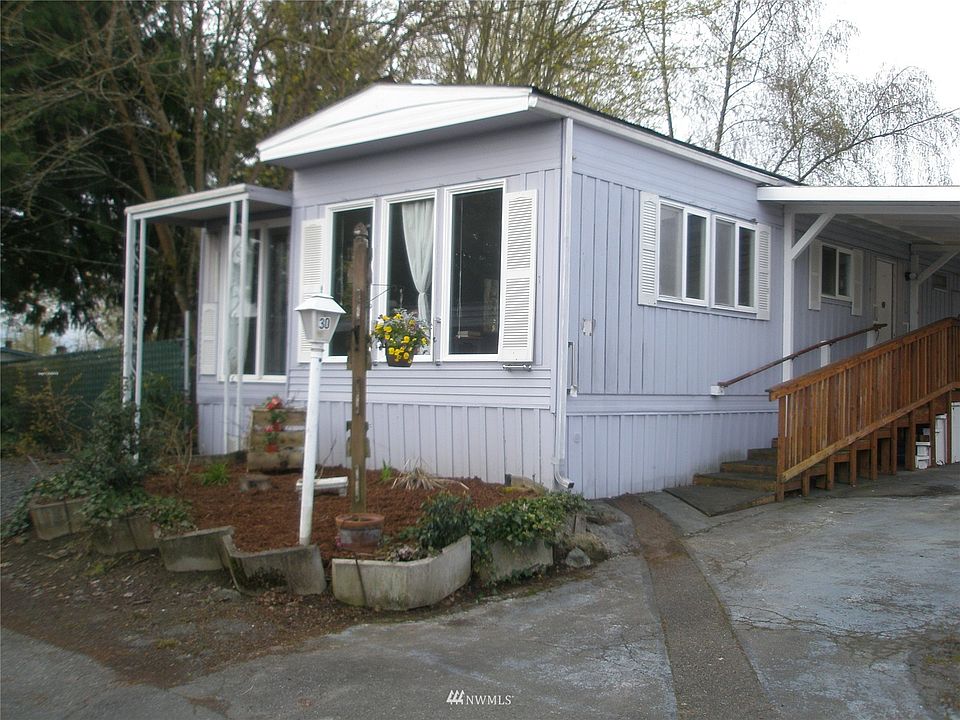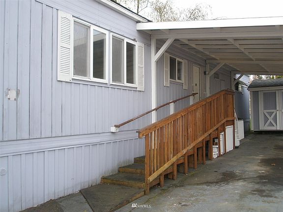 Great value abounds in this 936 Sq. Ft., 1967, 2 Bedroom, 1 Bath cutie in Carriage Club Estates, a 55+ mobile home park! This single wide on a little dead end culdesac with tip out has a cottage feel and a roomy floor plan! Features new vinyl plank flooring, double pane windows, newer interior paint, newer insulation underneath home, fenced-in back yard, big back deck, large wooden shed, tile counters & back splash, ceiling fans, and a propane free standing stove. Steps to clubhouse! Enjoy a beverage on the deck while looking out over your very private and quiet space. A few updates and you will have a great home! Park rent includes water, sewer and garbage. Close to bus line, ferry, Alderwood Mall, beach, medical, I-5 and Boeing!