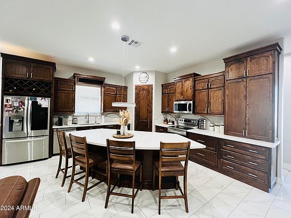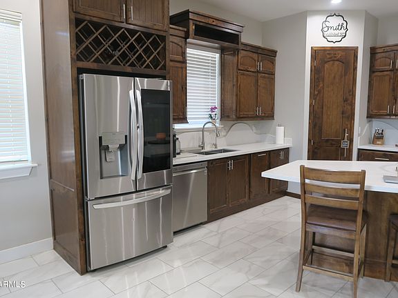 Come see this beautiful custom built, Santa Fe style home sitting on almost a full acre of horse property. This 4 bedroom, 3 bathroom house offers plenty of room for your whole family, plus two primary bedrooms with en suites. Enjoy the open concept living area with beautiful custom cabinetry throughout and a large kitchen island, perfect for hosting. The majority of the acre is enclose by a newly built block wall equipped with a 4 ft man gate and 12 ft RV gate. This property offers plenty of room for all your toys or animals!
