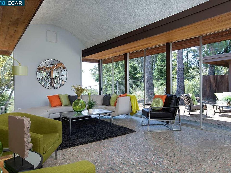 Designed by famous architect Jacob Robbins and featured in Sunset Magazine, this mid-century modern home is on the market for the first time! It has been lovingly preserved in its original condition with terrazzo floors throughout and radiant heat with six zones for your family's comfort. Large living spaces with fireplaces in the living and dining rooms plus a large family room easily flow to the outside for entertaining. Situated on a level .66 acre lot, this single story with walls of glass brings the outside in. Removed from Skyline, perched at the top of a freshly paved private lane, enjoy views of the San Mateo Bridge, bay, and city lights through the redwoods and pines. Visit this magical property and step into the time capsule. On sewer, not septic, and lateral compliant.