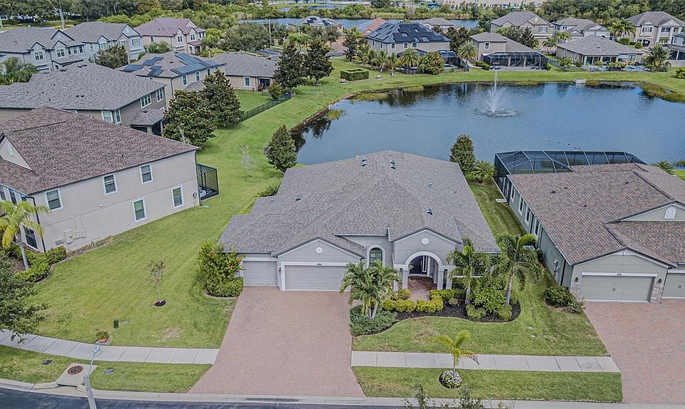 Welcome to Your Dream Florida Lifestyle. The sellers are contributing up to $10,000 to assist with the buyer closing cost. Located in a Private Gated Community. This beautiful MI custom retreat offers luxury, privacy, and elegance. Features 4 bedrooms, 3 baths, 3 half custom car garage, paved driveway, covered screened extended wrap around lanai, and a extended paved front porch. This beauty also offers a large inside laundry room, custom 2” blinds throughout, formal dining room, a private office and 12 ft triple patio sliding doors. The guest room boasts custom board & batten, new laminate flooring and walk-in closet. The 2nd master suite is set up as an In-Law Suite / Studio including a kitchenette, private bathroom with walk-in shower. The private office offers a large window with lots of lighting, electrical floor outlet, 8 ft double glass doors, and a private door that leads to the master bathroom. The gourmet kitchen is equipped with stainless steel appliances, a built-in wall oven, high 12 ft ceiling with can lighting, a large center island, elegant 42’ cabinets with crown molding, custom walk-in pantry with interior lighting, LED lighting under and over cabinets with separate switches, new dishwasher, new microwave (cabinet depth), new hot water heater, custom built-in pull-out storage drawers in lower island cabinet, custom small drawer under cooktop. The laundry room features cabinets and a folding counter. The layout of this home boasts both family & formal dining area, providing elegant spaces for entertaining guests. The heart of the home shines with its elegance, further enhanced by new upgraded stunning light fixtures throughout. In addition, the home boasts upgraded diagonal tile flooring, crown molding, and a long foyer. You will also discover a comfortable family room, the perfect place to relax & unwind after a long day. The family room, master bedroom and kitchen boast an outstanding view of the pond water fountain. This beauty is thoughtfully designed with an open floor plan ideal for both entertaining and everyday living. All bathrooms have been updated w/granite countertops & updated decorative mirrors. The master bedroom offering a peaceful sanctuary to escape & recharge, patio door, tray ceiling, and brand-new carpet. The master bath features a large walk-in shower, herringbone tile with a (direct office access door), separate vanities with sinks, & a private water closet (WC) for added privacy. These details elevate the everyday experience & create a spa-like retreat within your own home. Embrace the quintessential Florida lifestyle on the extended lanai, your private outdoor oasis. The covered screened extended wrap around lanai features a custom-made blind made by Coolaroo for privacy with a view of the beautiful large pond. The property sits on an oversized pond homesite! The pond offers a 24-hour fountain with gorgeous night lighting. The landscaping package boasts beautiful, elegant palm trees, landscaping lights and St Augustine Sod. Thinking about getting a POOL? This home is pre-wired for an inground Pool & Spa. The 2nd bathroom has a pool bath door. The garage features epoxy flooring, the 2 garage features 4x16 overhead metal storage racks, built-in folding workbench, pegboard and overhead lighting over folding workbench. The 3rd car garage offers an additional 4 ft side extension. Easy access to shopping, restaurants, MacDill Air Force Base, Brandon and TAMPA CROSSTOWN.