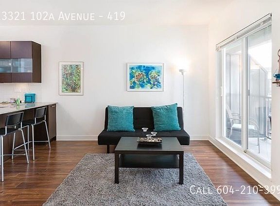 Top floor, modern studio apartment located in the heart of Surrey Central just steps away from everything you need! Wood frame building with facing views of the courtyard. Unit has in-suite laundry and a patio that faces the outdoor courtyard. Building has a good size gym with cardio & weight machines. Choose between semi-furnished or unfurnished. Included furniture: Bed frame & mattress Couch Table coffee Bedside closet Shelf by balcony long one Bar side chairs are for unit to book a viewing. Reference the address: "#419-13321 102 A Ave"