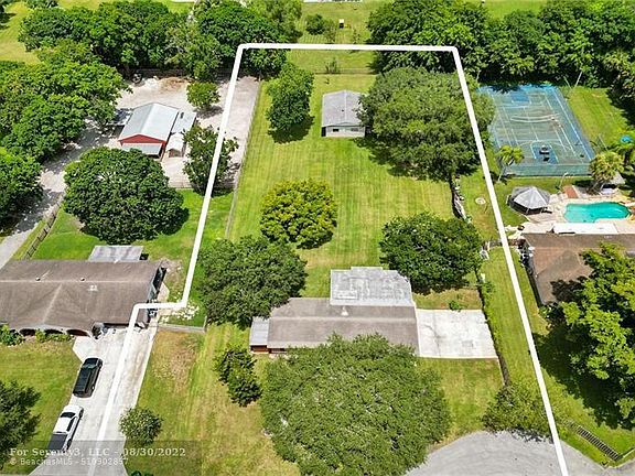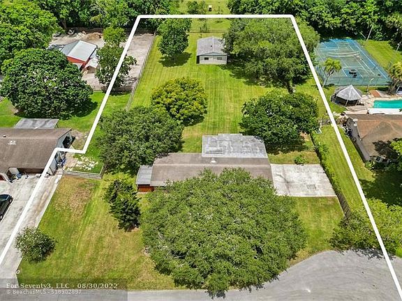 Welcome Home! Best described as Davie Charm! This home sits on a quiet culdesac and a beautiful acre of land. Home features new laminate flooring in living and family room. Split bedroom plan. Nice size kitchen with pantry and stainless appliances. Large laundry/utility room. Very neat and clean. Besides the home this property comes with an additional building. Currently being used as a large workshop but previously was a barn. Bring your horses and can easily be a barn again. Huge lot affords lots of potential to make your dreams come true. Plenty of room! A great opportunity to live in the desired and secluded community of Fla Fruitlands! Hurry on this one before it gets away.