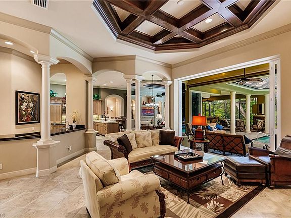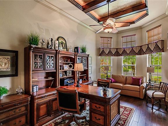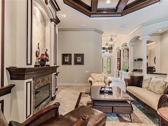 Beautiful Arthur Rutenberg custom home in Verandah, 1 of 6 on a great street at a cul-de-sac. This 3923 sq ft home has 4 bdrms+Den, 3.5 baths and loaded with features. A decorative inlaid glass door greets you into an open floor plan. Upgrades include crown through most of the house, accent lighting, diagonal tile, whole house generator, 2 new AC units, outdoor kitchen, indoor and outdoor fireplace, renovated laundry room, plantation shutters, central vac, water softener system, beautiful coffered ceilings, phantom screen door, security system, renovated laundry room with WiFi appliances.The Chefs gourmet kitchen features 5 burner gas cooktop, Viking refrigerator, Bosch dishwasher, double GE ovens, island with 2nd prep sink, 42" cabinets, and eat in kitchen adjacent to a Butler's pantry/Bar with sink, wine refrigerator and cabinets. All rooms are large and Master suite has coffered ceiling with custom accent lighting, plantation shutters, ample walk in closets, dual head shower, dual sinks,bidet and natural sunlight. The resort style Lanai completes the home with zero corner sliders,multiple seating areas, kitchen, fireplace, salt water pool and a VERY private exclusive setting.
