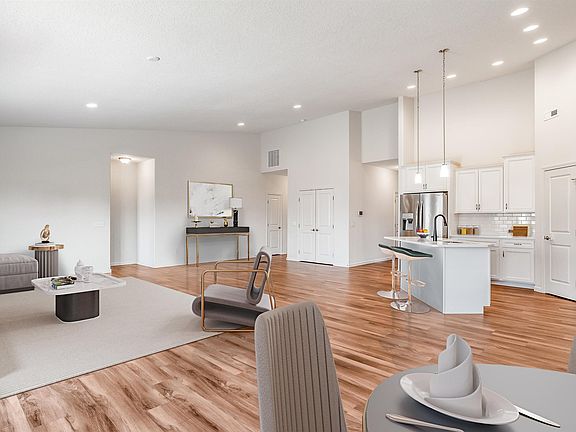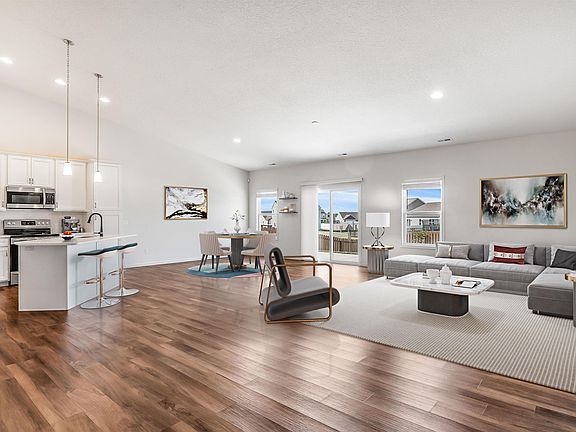 Come see the value and amenities in this like-new southwest home located in the Coves at Hawks Ridge with easy access to everywhere. Built in 2020 with custom features for the current owner, you can move in and enjoy summer with the established landscaping, fenced yard, and inviting paver patio with firepit. Few homes in this price point offer four bedrooms plus three full bathrooms and a separate laundry room. The split bedroom floor plan is great for privacy, guest accommodations and/or home office space. Note the vinyl plank flooring throughout the main foyer, kitchen, great room, and dining area. Also note the high ceilings, vaulted great room ceiling, neutral decor, and lots of natural lighting throughout. The spacious kitchen offers generous counter space, subway tile backsplash, and breakfast bar. All stainless steel appliances remain. Few ranch homes boast 2118 square feet of living space with a 3-car garage. Be sure to note the tiled walk-in in shower with glass doors in the primary suite. You certainly can't build this Andover floor plan today with a 3 car garage at the same price. A great place to entertain and practical floor plan for daily living.