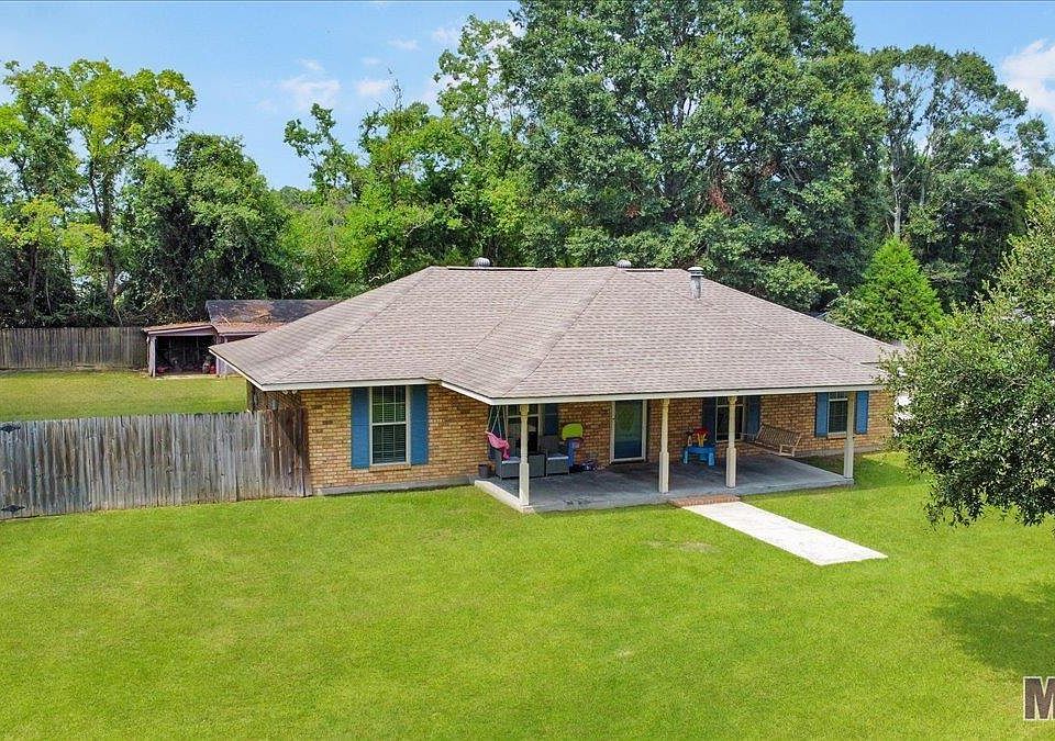 Welcome home to this charming 2-bedroom, 2-bathroom residence on a beautifully maintained 0.74-acre lot. Enhanced by a majestic live oak and vibrant landscaping, this property offers excellent curb appeal. Enjoy relaxing on the large covered front porch swing or spacious rear patio, both perfect for outdoor living. The fenced rear yard features a solid board fence and an additional storage building. Inside, you'll find durable Luxury Vinyl Tile Plank flooring in the main living areas and ceramic tile in the bathrooms. The living room boasts a vaulted beamed ceiling, ceiling fan, and a cozy Pot Belly Stove fireplace. The kitchen is well-appointed with solid countertops, a breakfast bar, electric range oven, microwave, and ample cabinets, plus an adjoining breakfast area. The thoughtful floor plan is sure to impress. Schedule your private showing today!