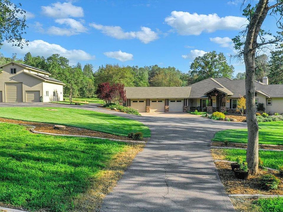 One of a kind stunning estate setting with 10 gentle rolling acres. Gated and fenced, this beautiful one story home was built with top quality materials, 2X6 construction and is perfectly placed in the center of the 10 acres. In ground swimming pool, basketball court, gas firepit fenced garden and chicken house. Detached 40X56 s.f. metal shop with bathroom and upstairs 680 s.f. conditioned space with another bathroom. The open floor plan of this beautiful home features a dramatic living room with soaring windows and doors leading out to the covered patio and hot tub. Gourmet kitchen with double ovens and double dishwashers is great for large parties and the formal dining room will seat 12 comfortably. Primary bedroom wing at one end of the house has exterior access and big windows, wonderful master bath with sauna and double sinks. Guest wing at the other end of the house is great for a large family. The 3 car garage is finished and huge paved driveway for lots of toys!
