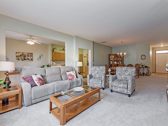 Move in ready!!! This home is model perfect and feels brand new! So much has been done to update this spacious home! Over the past 4 years, the homeowner has: - painted all rooms and ceilings - had all new carpet installed throughout - added new gleaming Quartz counters in the kitchen - new furnace motor (2019) - new faucets - and added new stone look floors in the kitchen! There are absolutely lovely living spaces, filled with natural light. Large dining area flows right into the ample sized living room, perfect for entertaining! The kitchen boasts tons of counter space and a large, sunny eat in area with a ceiling fan and the sliding door leads you right out to your patio. 2 excellent sized bedrooms and a large shared bath with double bowl sink, linen closet, ceramic tiled tub/shower. The front bedroom boasts a lovely bay window, the master bedroom is large and has a great walk in closet and ceiling fan. High ceilings throughout add to the spacious feel. The mudroom with additional storage and full sized washer and dryer is right off the kitchen leading into the garage. What a beautiful exterior too! Brick on the bay window enhances the curb appeal. Spacious 2 car garage offers additional storage. Enjoy the 55 and over lifestyle that only Carillon can offer! 3 pools, golf, tennis, bocce ball, exercise facility, clubhouse, and more!