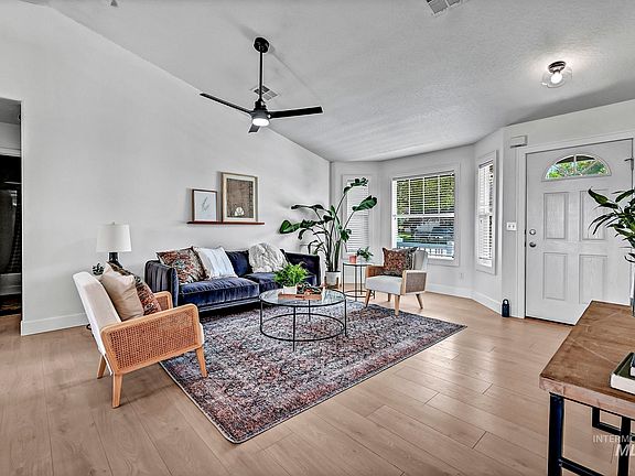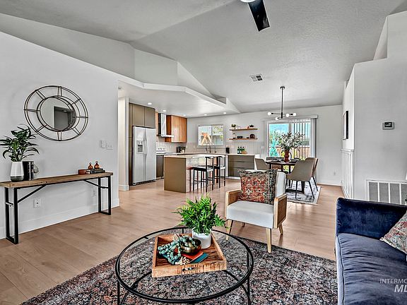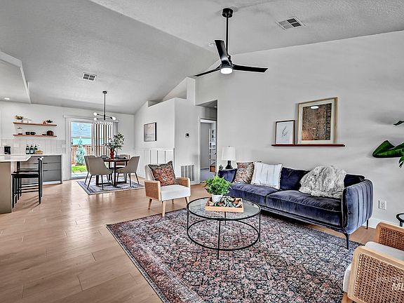 Adorable & updated home in a convenient location close to everything! Notice the home's terrific curb appeal which includes a manicured front lawn & relaxing front porch with lovely stone columns. Enter to find gorgeous wood laminate flooring & modern light fixtures & fans throughout. Vaulted ceilings enhance the spacious living area & the renovated kitchen is a chef’s dream, featuring sleek modern cabinets, a stylish tile backsplash, open shelving, & beautiful countertops. The thoughtful split-bedroom design offers privacy & comfort, while a built-in Murphy bed & custom bunk beds add versatility & charm. Step outside to your backyard oasis, complete with a pergola, swingset, large storage shed, raised garden beds, & a concrete paver patio, perfect for barbecues or entertaining friends. Centrally located near Lowes, The Village shopping center, grocery stores, & great parks, this home offers an amazing combination of accessibility & appeal. Make this dream home yours today & enjoy modern living at its finest!