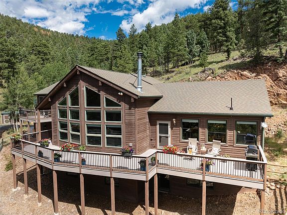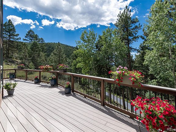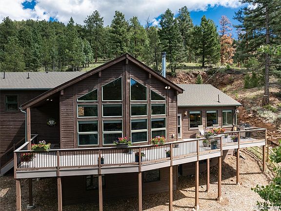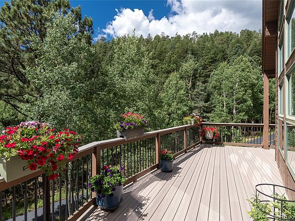 Stunning VIEWS of Pikes Peak from most rooms in this lovely updated contemporary mountain home! This home has abundance of personality with new luxurious wood extra wide plank flooring, new designer bathrooms with perfect color choices! Enjoy the fabulous views from the new low maintenance decks. Five acres to roam and a fenced in area around the home for your dog. Handy new storage shed, all on a paved south facing driveway which helps with snow melt. Dead end road privacy ensures you can enjoy your sanctuary. The soaring ceilings, large windows and stylish updates makes this home a perfect place to call home. Granite kitchen, large pantry, walk-in closets, weight room, plenty of storage, all with a walkout basement and room to add a 4th bedroom if you need it. This is the home that you've been waiting for!