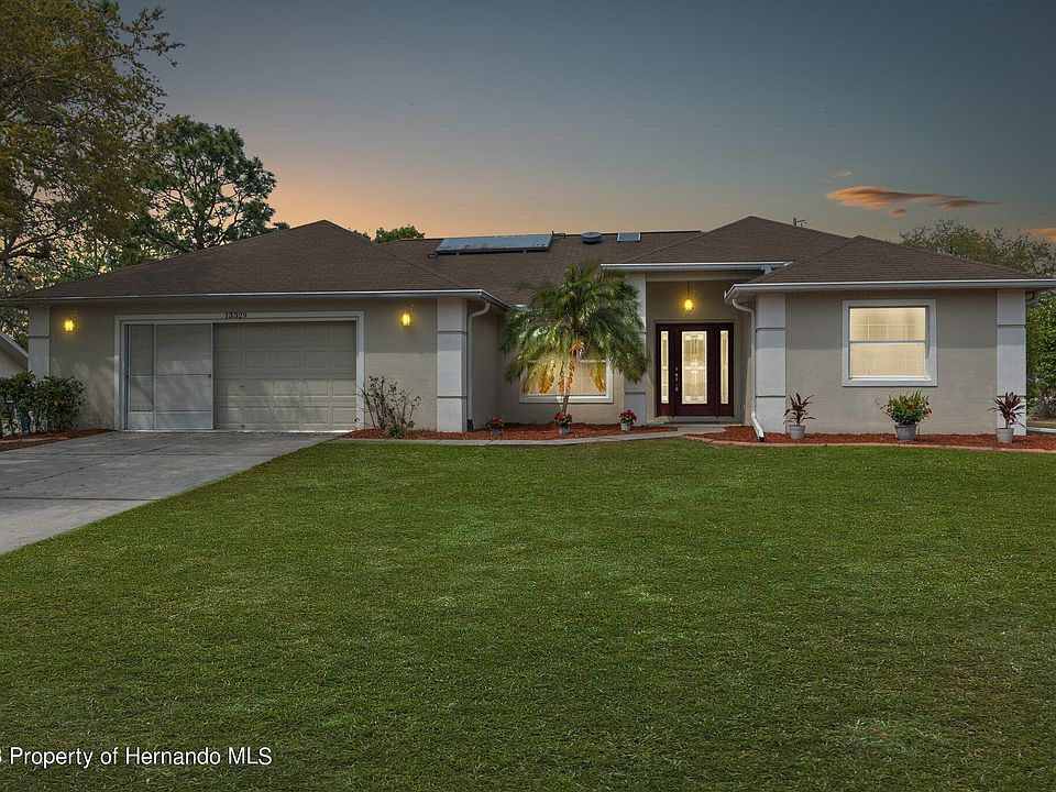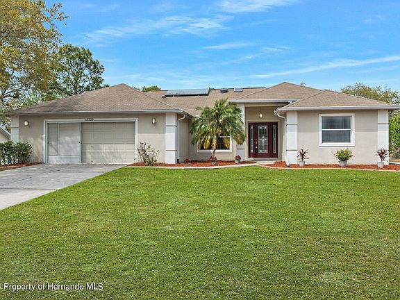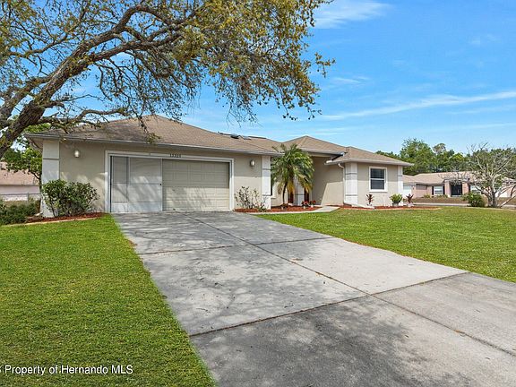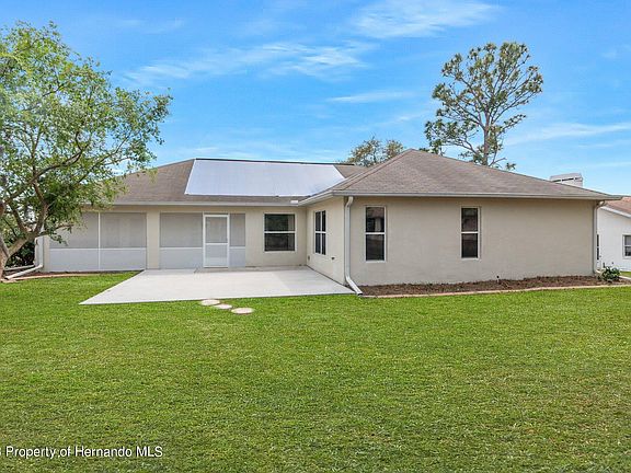 Active Under Contract Accepting Back up offers. LARGE BEAUTIFUL HOME, MOVE-IN READY with BRAND NEW ROOF being put on before closing!! Large corner lot in a great location in Spring Hill!! 2,121 sq feet of living space (2,929 total sq ft) with an open floor plan and high ceilings it all makes this home feel, light, bright and SPACIOUS!! 3 bedrooms + 2 bathrooms + formal living room + formal dining room + large family room + breakfast nook + walk-in pantry + huge OVERSIZED garage (29 x 22) with screen sliding door + large outdoor covered and screened lanai + basket ball court slab (or use or out door living space!! The kitchen is the center to the home with real wood cabinets, lots of counter top space and storage space, a large breakfast bar and is open to the breakfast nook and large, spacious family room!! Newer flooring throughout most of the home! The home as a split floor plan to give privacy to the master suite. The master bedroom has double glass doors to the screened lanai and two large walk-in closets! The master ensuite bathroom has dual vanities and sinks, a large jetted soaking tub and a walk-in shower! Solar water heater. Built in 2004, NEW ROOF being installed 2023 before closing. The large back lanai and concrete slab make for a great place to entertain your friends and family. The oversized garage is large enough to have a workshop or store motorcycles, bicycles, ATVs, and all sorts of stuff! Beautiful Exterior elevation and nice double door, grand entrance with 8 x 6 front lanai to decorate for all the holidays! AC 2004. NO HOA. NO FLOOD. Close to the Suncoast Parkway for easy and quick access to Tampa Bay for work and play! 40 minutes to Tampa International. 1 hour to the 2 of the top US Beaches. 15-20 minutes the Weeki Wachee River for kayaking, Buccaneer Bay Water Park, sunsets at Pine Island, boating and fishing in Hernando Beach. Great location in 34609!