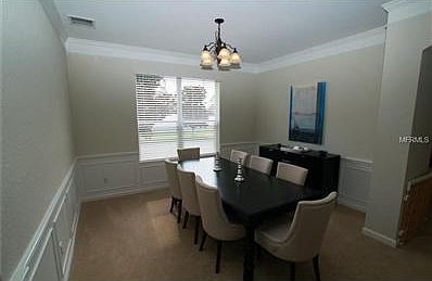 Corporate Relocation sale. House in excellent condition used mainly as a second home. Terrific floorplan with all 5 bedrooms en-suite. One guest suite on first floor that could be used as a play/bonus room. Striking "glass wall"- 3 sets of sliding doors leading to the large screened patio. No tiny bedrooms in the house. Kitchen features granite counters, tasteful brandy color maple cabinetry, and stainless steel appliances including refrigerator. This Florida home also has ample closet space. Large corner lot with plenty of room for a pool. Floorplan already includes pool planned half bath. Paver driveway and 3 car garage add to the appeal. 2 blocks to community pool with lap lanes and restrooms as well as a covered playground. Low HOA fees for this neighborhood. Home Warranty included. Very desirable schools.