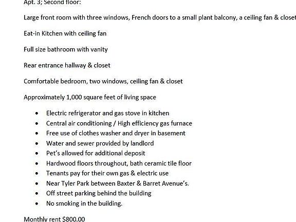 Available October, 1, 2020 Second floor: Large front room with three windows, French doors to a small plant balcony, a ceiling fan & closet Eat-in Kitchen with ceiling fan Full size bathroom with vanity Rear entrance hallway & closet Comfortable bedroom, two windows, ceiling fan & closet Approximately 1,000 square feet of living space -Electric refrigerator and gas stove in kitchen -Central air conditioning / High efficiency gas furnace -Free use of clothes washer and dryer in basement -Water and sewer provided by landlord -Pet's allowed for additional deposit -Hardwood floors throughout, bath ceramic tile floor -Tenants pay for their own gas & electric use -Near Tyler Park between Baxter & Barret Avenue's. -Off street parking behind buliding -No smoking in building