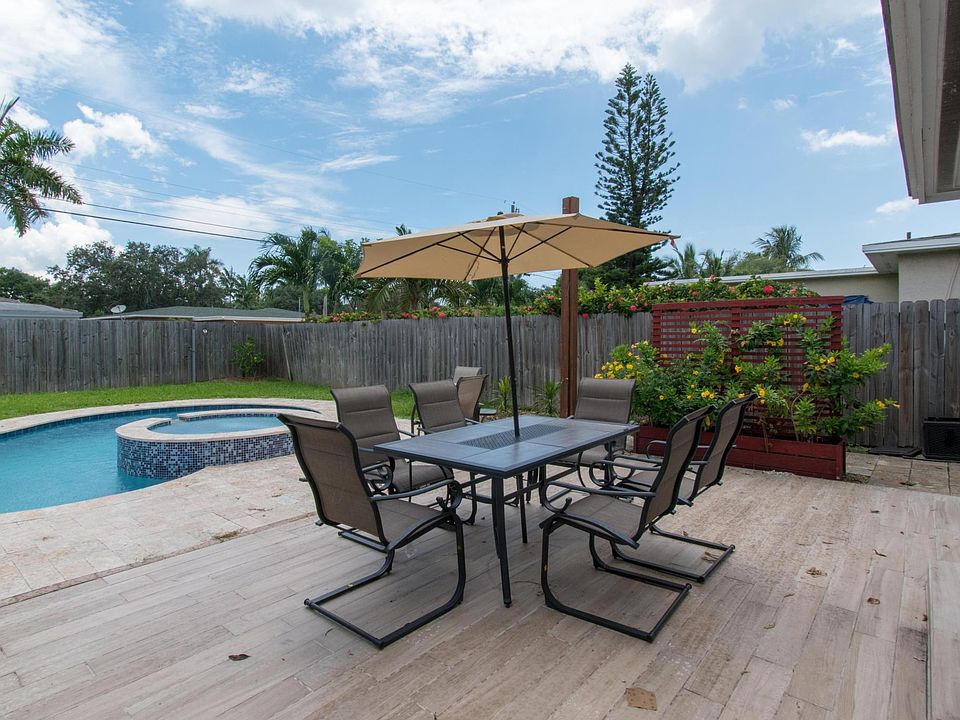 The rent is all-inclusive and includes a weekly pool service, twice-a-month landscaping, water, and electricity. The house is available for month-to-month rentals, or longer periods. This wonderful midcentury style home features beautiful touches and a stunning pool. Cozy furnishings, stunning accents , and comfy new beds will ensure a comfortable stay. We love the accents of this home with its vintage touches and fully stocked spacious eat in kitchen. Close to Hallandale beach, Hollywood beach, and tons of shopping. 10 minutes from Aventura mall and 5 minutes to gulf stream casino and shopping. Highlights: - Private pool (can be heated) - Propane grill - large backyard space with picnic table The home features a beautiful living room with sleeper sofa for 2. Bedding provided. Also fully stocked eat in kitchen and dining area. The mid-century modern flair adds charm and beauty to the setting in each room. BEDROOMS: 1. Bedroom with a (Master) KING SIZE BED two full closets, dresser, TV and access to a full private bathroom- double vanity and shower. Mini split ac unit inside bedroom for better control on temperature. 2. Bedroom with a QUEEN SIZE BED, access to pool, full closet, dresser and TV. 3. Bedroom with TWO TWIN SIZE BED, dresser, tv, full closet and own a/c system. Home has central ac, 2 living spaces, dining area, fully stocked kitchen, washer and dryer free of charge and the best part outdoors: an amazing private pool and lounge chairs for you to soak up Florida's sunshine. Second bathroom has a shower/tub combo. The driveway can hold up to 4 cars. Please do not park on the grass! Baby items (pack n play and high chair) are provided upon request. The pool can be heated upon request to 87 degrees and the spa (sitting area) to 90 degrees. This is a sitting spa, there are NO jets! Heating for the pool must be purchased from the guest store. - Please note - It is impossible to set a timer for the pool heater, It must be manually turned on and off with the app.