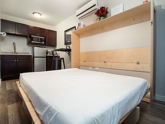 Furnished Micro/Tiny unit - Price advertised is 12 month rate. Kitchenette with granite countertops. Durable hardwood-look plank flooring runs throughout the unit for clean, modern styling. This unit comes furnished with the built in queen size Murphy bed, smart TV, and small dining table that fits the space perfectly. Electronic entry and covered parking are included. No laundry in unit or available on site.FAQs:What are your rental requirements?We focus heavily on credit and rental history. We will look at all aspects of an application when making a decision.How much does it cost to apply?We do not charge application "fees" but we do require you pay $25 for a credit/background screening in TenantCloud via Transunion.Do you charge admin fees?No, we do not charge the typical admin fees of other property management companies. Our listings explicitly list out all charges that you can expect.How are utilities charged?Generally each property has a flat rate for common utilities and residents are responsible for metered utilities.How do I pay my rent?Rent may be paid via ACH for a small fee ($1.50 per transaction) or Credit/Debit card for a percentage based fee.How does maintenance work?All requests are submitted via the TenantCloud portal and then assigned to the appropriate contractor.