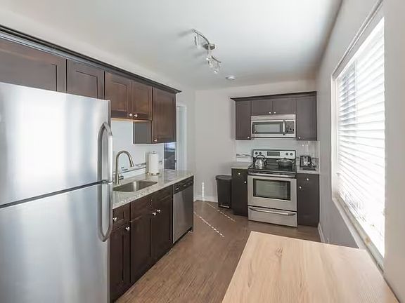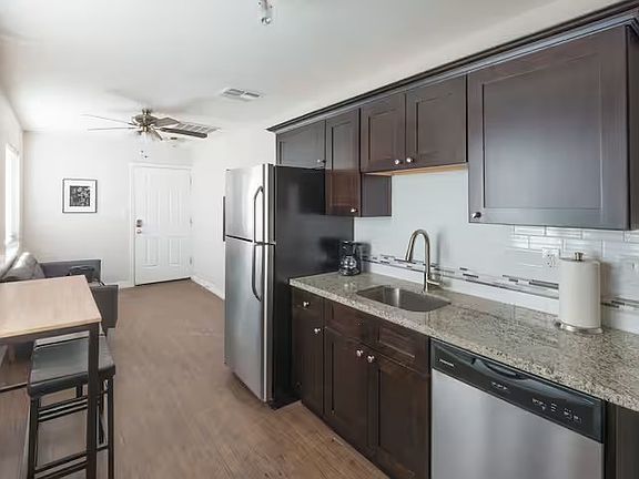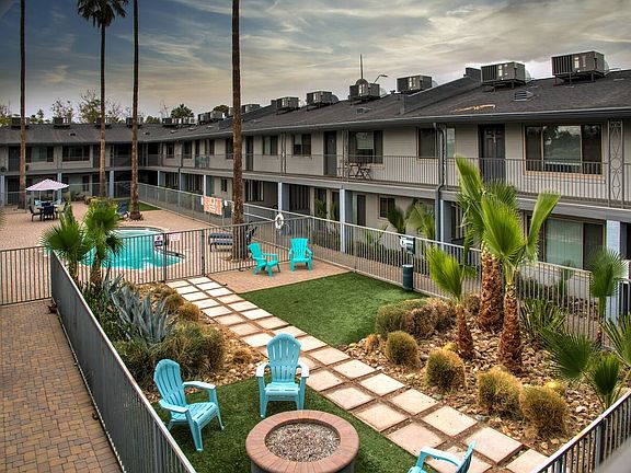 Welcome to Coronado Flats! We offer modern amenities in a quiet building close to everything in Central Phoenix. This cozy upper level one bedroom features a full gourmet granite kitchen and in-suite laundry, eat-in dining area Roku Smart TV included. The property features a beautiful pool surrounded by landscaped grounds for entertainment! Gated/secure units with covered alley parking. Furniture negotiable if desired!