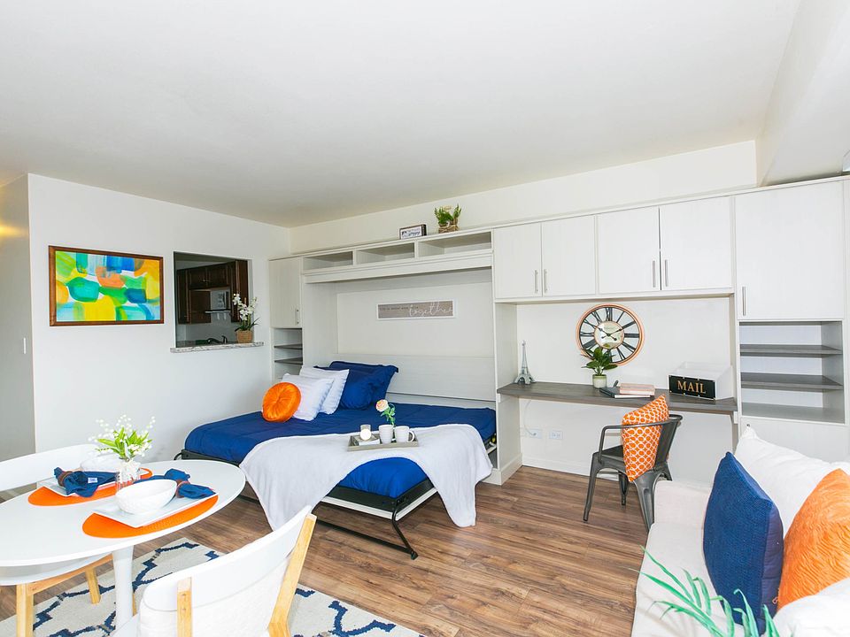 Renovated and remodeled studio condo unit in Makiki and in an awesome location. Upgrades completed in 2017 include new range/oven, microwave hood, refrigerator, quartz countertops, and cabinets. Renovated full bath with new vanity, light fixture, hardwood laminate flooring, and newer A/C unit. Must see built in combination murphy bed, book shelves, and desk. Enjoy the convenience easy freeway access, minutes to shopping, Whole Foods, Ward 16 Theaters, Ala Moana Center, and Ala Moana beach. Building repairs were completed in 2018, which included concrete spalling repairs, waterproofing, and painting project adding value. Buyer must act now.