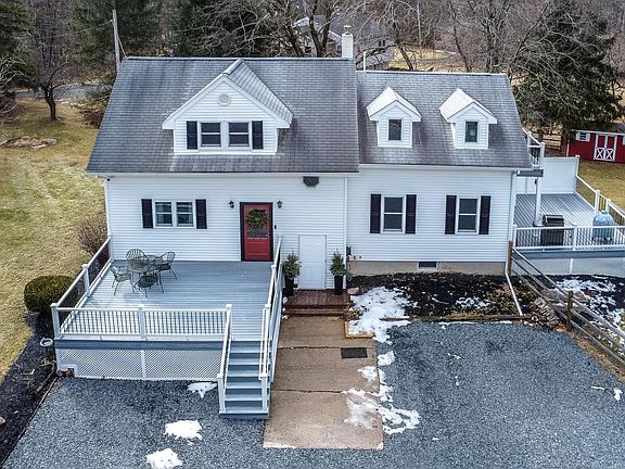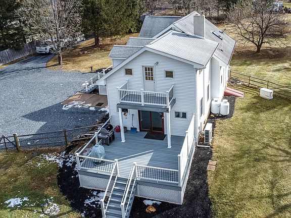 Located on a private lane is this well cared for home on over 3 acres with a 4 car detached garage. The main level has a formal dining room, large eat in kitchen and a lovely family room with a gas fireplace and doors to the large maintenance free deck that overlooks the private rear fenced in yard. The second floor has 2 large bedrooms including the master which has a private deck, perfect for enjoying your morning coffee, while listening to the sounds of nature. A nice hall bath completes this level. The full basement has easy outside access and plenty of room for storage and workspace. There are three heating options including heat pump mini splits, wood stove, and oil fired hot water baseboard. Two new garage doors were just installed on the 4 car garage and the rear yard is fenced. There is an additional fenced area that was used for goats and there are two sheds and an outhouse. Did I mention the Generac whole house generator, Trex Decking (with reinforcement for a hot tub), High Efficiency Boiler (2021) and all new Anderson Windows (2022) which cost $60k? Located in award wining Palisades School District and close to everything Upper Bucks County is known for. 2 minutes to the Delaware River and Canal, Ringing Rocks Park, The Giving Pond and 10 minutes to Frenchtown NJ and Tinicum Park. Welcome Home!