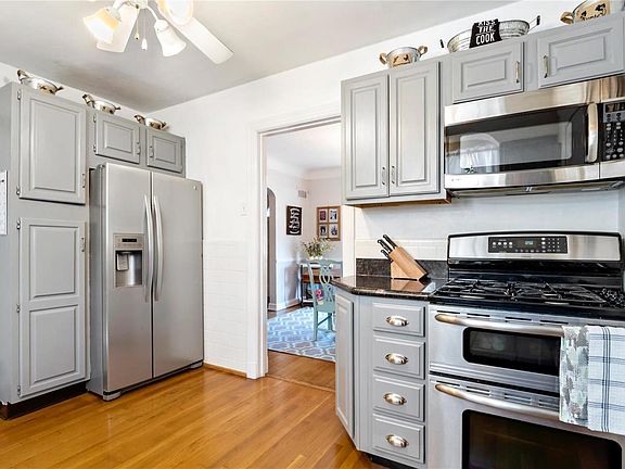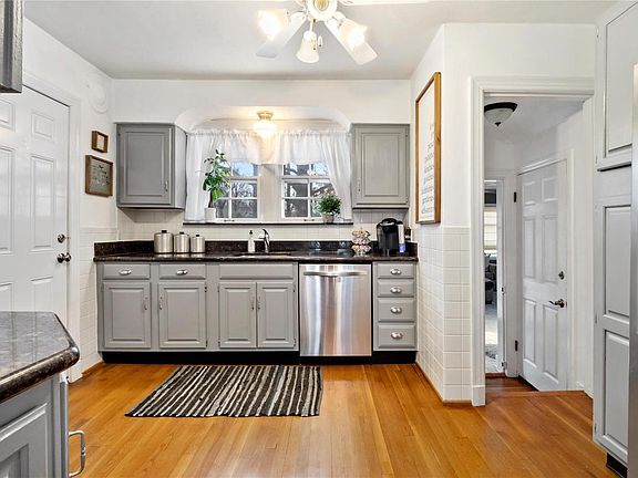 Charming 1.5 story in Glendale! This Colonial style home offers tons of fresh updates, gleaming hardwood floors and nearly 1,400 sqft of flexible living space. Enter into the cozy Living Room with a traditional wood burning fireplace. Travel under a charming archway into the light and bright formal Dining Room with gorgeous bay windows and chair rail molding. The open Kitchen, with sparkling granite countertops and stainless steel appliances, leads you to the back 18x18 Family Room with plush carpet and access to the backyard patio, which offers additional space to relax and entertain! Upstairs, you'll find two spacious bedrooms and a full bathroom. Unfinished Basement is open and tidy, with laundry and plenty of space for storage. The park-like backyard is extremely private with mature trees and lush greenery surrounding the fenced-in lot, plus a large patio for outdoor entertaining. This Glendale charmer is ideally located just minutes from Webster Schools and Larson Park!