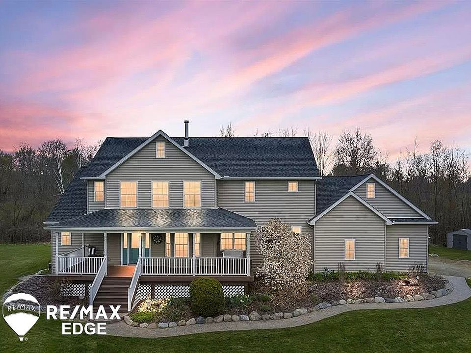 Welcome to this exquisite dream home set on a picturesque 10-acre lot, offering luxurious living in a serene setting. This spacious residence features 4 bedrooms and 4.5 bathrooms, including a stunning first-floor primary suite with a walk-in closet and a 4-piece bathroom. The great room impresses with its stone fireplace, built-in custom cabinetry, 2-story ceilings, and large windows flooding the space with natural light and providing a beautiful view. The dining area and kitchen, complete with a large center island, are perfect for entertaining guests. Additional highlights include a first-floor office or formal dining room with French doors, a first-floor laundry room, and a full bath off the garage for convenience. The second story is open to the great room and offers a second office or den area, along with two bedrooms, each with their own private bathrooms and walk-in closets. The fully finished basement adds even more living space, featuring a large bar area, family room, 4th bedroom, and another office space. Outside, a huge deck, patio area, and fire pit area provide the perfect areas for outdoor gatherings and relaxation. Completing this remarkable property is an attached 3-car garage and a large pole barn. Don't miss the chance to make this extraordinary home yours—schedule a showing today and experience its beauty firsthand