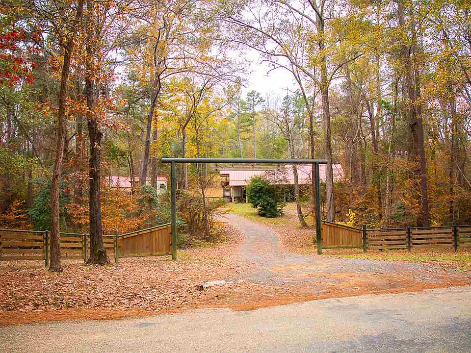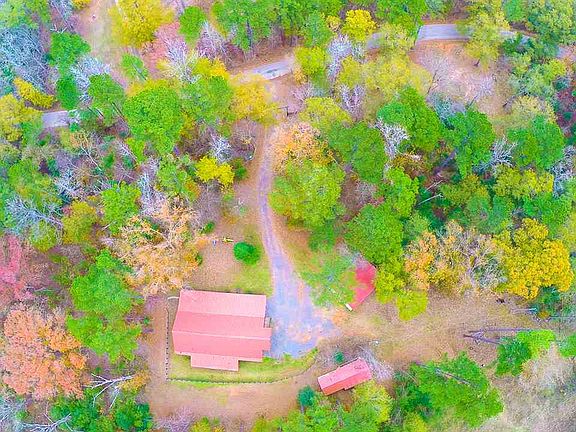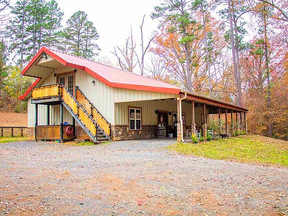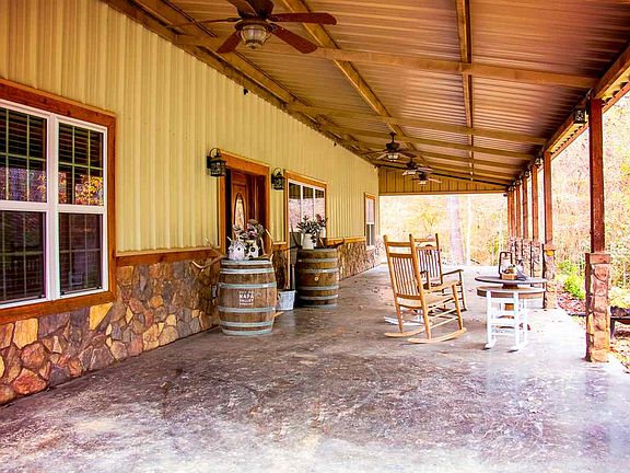 Rustic custom Metal/Stone home nestled on 8.348 wooded acs. Open living with split bedrooms with approx 2400 sf living with an additional upstairs ready with plumbing and duct work to be completed for additional living space. Two storage/workshop areas with covered parking for cars, boats, etc. Property has some pipe fencing.