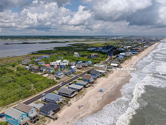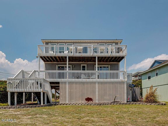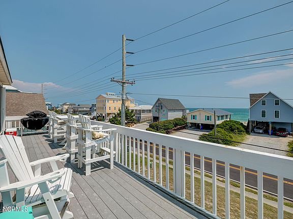 Beautiful ocean views, constant breezes and direct deeded beach access across the street! This wonderful beach house comes furnished and is located in a perfect spot on the island. Easy bike ride to pier, shops and restaurants. The reverse floorplan features living space on the top floor to take in the gorgeous views from the vaulted living room, dining room and updated kitchen. The open composite deck spans the top floor and is a great spot for sunbathing and taking in the ocean view. The middle floor features all 3 BR's with ensuite master bath with tile shower and second full guest bath. Covered porch on this floor is perfect for nap time or reading a book in the shade. Covered carport offers plenty of room for parking or rinsing off in the outdoor shower. The shed provides space for all of your beach gear. Updates include new roof in 2018, New HVAC in 2024, High impact vinyl windows and LVT flooring.
