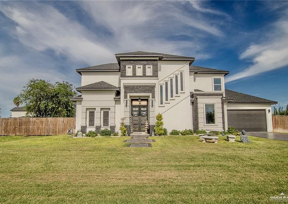 Situated on 0.69 acres, this beautiful two-story residence in Donna is thoughtfully designed for both everyday living and entertaining. With 5 bedrooms and 3 bathrooms, the home showcases an open living area filled with natural light from large custom windows. The kitchen features quartz countertops and a generous center island. The spacious primary suite provides a private retreat with a soaking tub and separate shower. Outdoors, enjoy a pool and patio ideal for relaxing or gatherings, along with an added back yard floor for gazebo, a pavilion with stamped concrete flooring and plumbing connections, and a convenient mini utility cabin. Don't miss out on this opportunity! This home is a must-see.