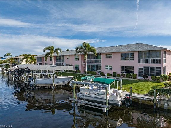 Welcome to your Gulf Access waterfront 55+ condo just minutes from the river and downtown Cape Coral. First floor condo with 3 bedrooms and 2 bathrooms. Primary bedroom has a slider to lanai and window looking out to the canal and features an ensuite bathroom with large walk-in closet with built in shelving. The split floor plan offers privacy for guests with two additional bedrooms and a private bathroom. The large screened lanai overlooks the canal and stairs lead down to a patio area and community pool. Laminate wood flooring in living room, dining room, tile in kitchen and baths. The kitchen and baths have granite countertops and updated cabinets. The laundry room has a full-size washer and dryer with lots of cabinets for storage. Unit has a 1 car detached garage with shelving for storage. New AC (2023) Washer/ Dryer (2021) Water Heater (2016) Roof (2021). Seller is offering $3500 flooring allowance. Make an offer, seller is motivated. Piano and quilt rack do not convey.