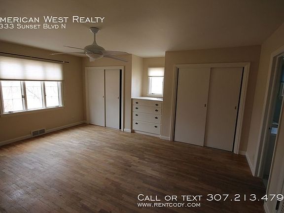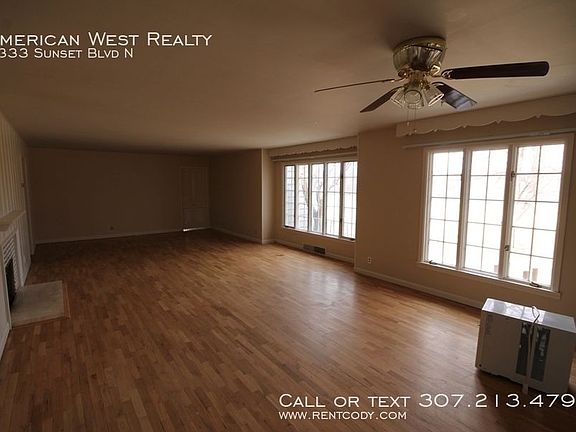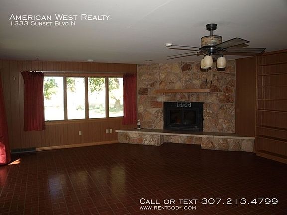 NOTE: This home is available to be shown Tues-Fri after 1PM. This 5,000 square foot home is located on a beautiful 1.5 acre lot with in-ground sprinkler, mature trees, and great views. Two blocks from the museum and West Park Hospital, the home is centrally located but very well hidden! There are five bedrooms, three bathrooms, three wood-burning fireplaces, three living/family rooms, a formal dining room, and you won't believe how much storage there is! Hardwood floors in most of the main floor. Lots of bright windows, sliding glass door and three walk-out doors. A patio is located directly off the kitchen for a grill and a larger patio in back for outdoor furniture where you can sip coffee and watch the deer play in the spacious back yard. There is far too much home to describe so please schedule a time to take a look. Note: A dog up to 25 lbs. may be negotiable for additional rent but the yard is not fenced. Tenant is responsible for all utilities and landscaping. All leases are subject to a $20 Resident Benefits Package. You can review the benefits under TENANT RESOURCES APPLICATION AND RENTING POLICY or contact the office for more information. _____________________ Information presented is deemed reliable, but is not warranted. Interested parties are responsible for conducting their own inspection to confirm the accuracy, completeness, currency, and status of all information before renting any property. _____________________ General requirements: All occupants 18+ must complete an application $30 application fee per person Submit a government-issued picture ID Prove combined income of 3x monthly rent To see our most updated list of rentals or learn more about our screening process, visit the American West Realty and Management website. _____________________ INVESTORS: are you looking for professional property management or an agent that can help you sell or expand your investment portfolio? Contact American West Realty and Management today to learn about our services! Air Conditioning Central Air Ceiling Fan Flooring Hardwood Garage Heat Forced Air Heat Gas Fireplace Kitchen Dishwasher Kitchen Refrigerator Kitchen Stove / Oven Sprinklers Automatic Utility Black Hills Energy Utility City Of Cody (Water, Electric, Sewer, Trash) Views Washer/Dryer Hookups