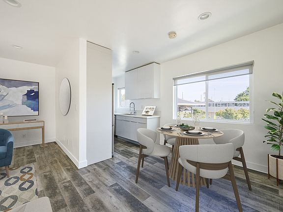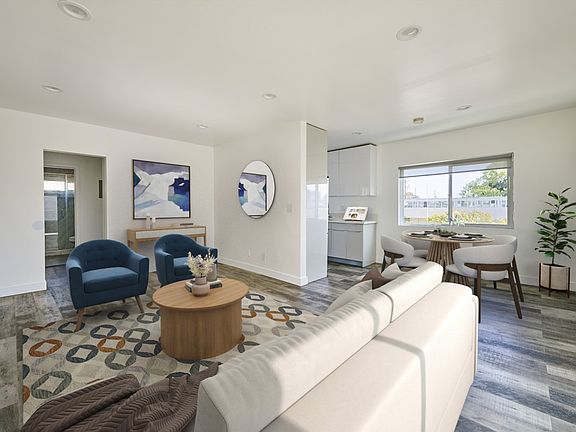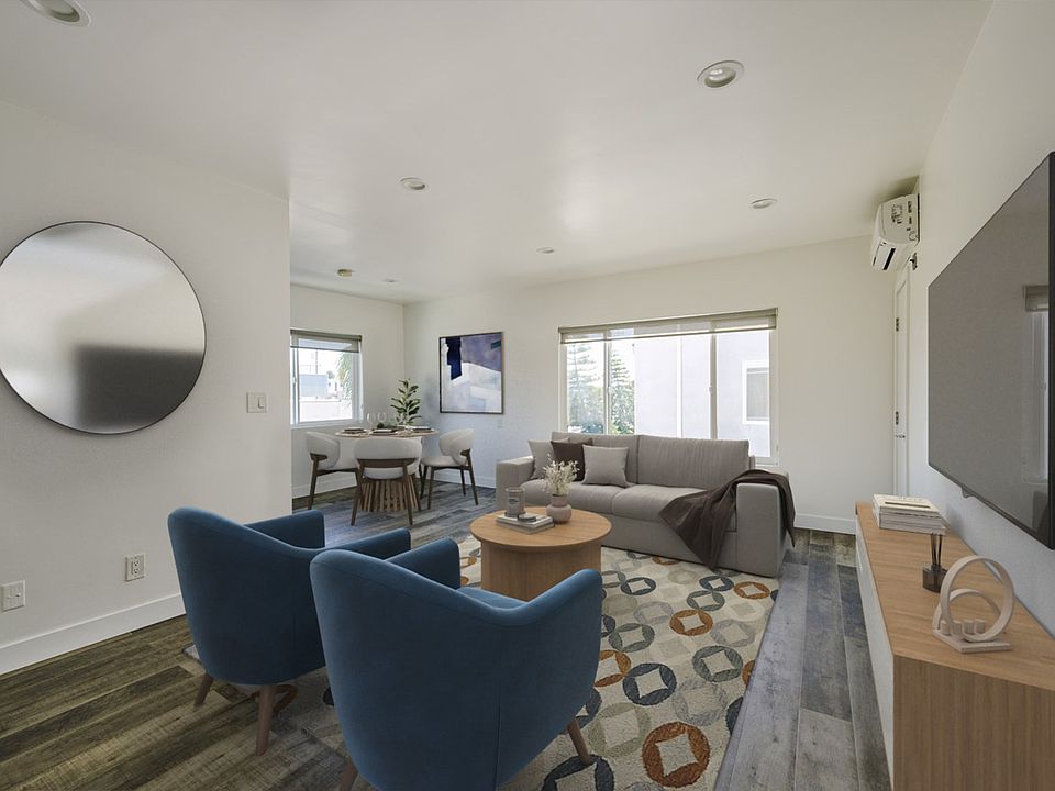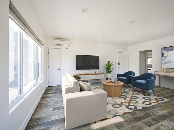 Carefully restored and designed by a renowned LA designer, these 1960s modern luxury rental homes feature keyless entry door locks to spacious one and two-bedroom floor plans with newly renovated kitchen and bathrooms. The kitchen boasts sparkling white stone quartz countertops with brand new self-closing cabinetry and high-end stainless-steel refrigerators with matching gas cooktop with oven and microwave. iRing doorbells with a smart home video security camera are also included. There's a community washer and dryer on site. Bathrooms feature porcelain tiled bath tubs and glass shower doors. Each rental home also includes central A/C cooling and heating with recessed lights with luxury style cellular shade window blinds and distressed wood plank floors.