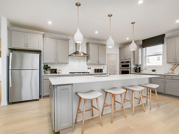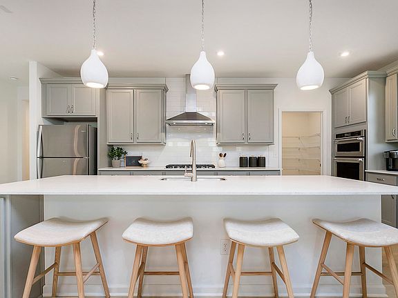 Experience the elegance of the Palmary floorplan in Finch Creek by Del Webb, a premier 55+ community. This thoughtfully designed home features a modern kitchen with 42" Landen white cabinetry, Calacatta Elysio Quartz countertops, brushed nickel hardware, a built-in stainless steel oven and microwave, gas cooktop, and a spacious island-ideal for both everyday meals and entertaining. The kitchen flows seamlessly into the gathering room with a cozy fireplace with a granite surround, as well as a charming cafe dining area, creating a warm and open living space. Step outside to the covered patio, perfect for relaxing or hosting guests. The luxurious owner's suite offers a peaceful retreat, complete with a tiled shower, double-sink vanity with quartz countertops, and a generous walk-in closet. The secondary bedroom enjoys easy access to a conveniently located full bath with a shower just steps from the door-perfect for guests or everyday use. A versatile flex room, enclosed with doors and situated just off the foyer, can serve as a home office, study, or additional bedroom to suit your needs. Luxury vinyl plank flooring runs throughout the home, offering both timeless beauty and long-lasting durability. The Finch Creek by Del Webb community is where lifestyle takes center stage. Residents enjoy TV streaming and internet included, plus convenient seasonal opening and closing of irrigation systems. The resort-style amenities include indoor and outdoor pools, a state-of-the-art fitness center, pickleball and bocce ball courts, and a clubhouse featuring social programming led by a full-time Lifestyle Director. A high-tech simulation room offers virtual golf and other sports, while 8.5 miles of walking trails, pocket parks, and a dog park encourage an active, outdoor lifestyle. Photos of similar photos.