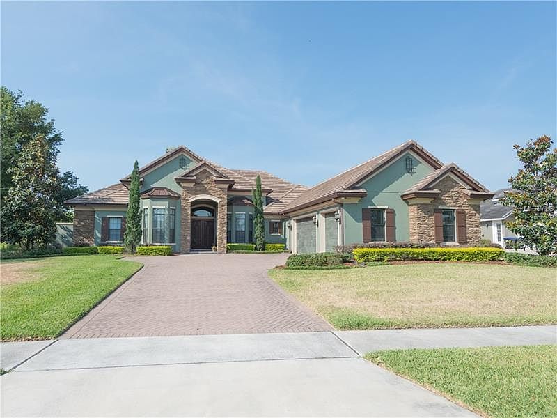 This is the one! Lake-front Arthur Ruttenburg custom home featuring 5 bedrooms and 3.5 baths with an open, non-buildable HOA green space to the left. Enter through the elegant solid wood front doors to an open floor plan with soaring 12' ceilings and a view of the sparkling solar-heated salt-water pool (complete with a lap lane and spa) and Lake Clarice. The luxurious master boasts another gorgeous view of the pool and lake from the sitting area, his and her walk-in closets, and a glamorous bath with his and her vanities, soaking tub, and indoor/outdoor shower. The gourmet kitchen is outfitted with the latest appliances including a gas range, Advantium wall oven, warming drawer and massive all-refrigerator/all-freezer combination and pot-filler. With separate living and family rooms each opening onto the oversized covered lanai and pool deck by way of sliding walls of glass, the outside truly comes in making this home perfect for entertaining. Four bedrooms flank the opposite side of the house. The 5th bedroom is currently being used as a media room/theater with state-of-the-art technology, most of which the home owner is willing to leave. The entire home is wired for surround sound as well. This home also features a stunning library with floor to ceiling custom bookcases. The three-car garage, brick paver driveway, gas tankless hot water heaters, tile roof and automated window shades all deserve a mention as well. Bring your highest and best offer. Close to Disney, The Grove, and S.R. 429.