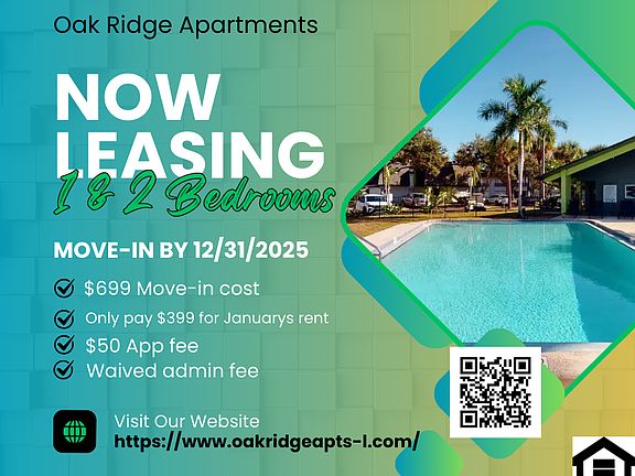 Residents have lots to love about living at the Oak Ridge Apartments nestled near the heart of Largo, Florida. Our premier rental community offers everything from spacious floor plans to open-access amenities and convenient commuting. All of these wonderful lifestyle benefits mean you'll be feeling right at home right away. 7-12 Month Lease