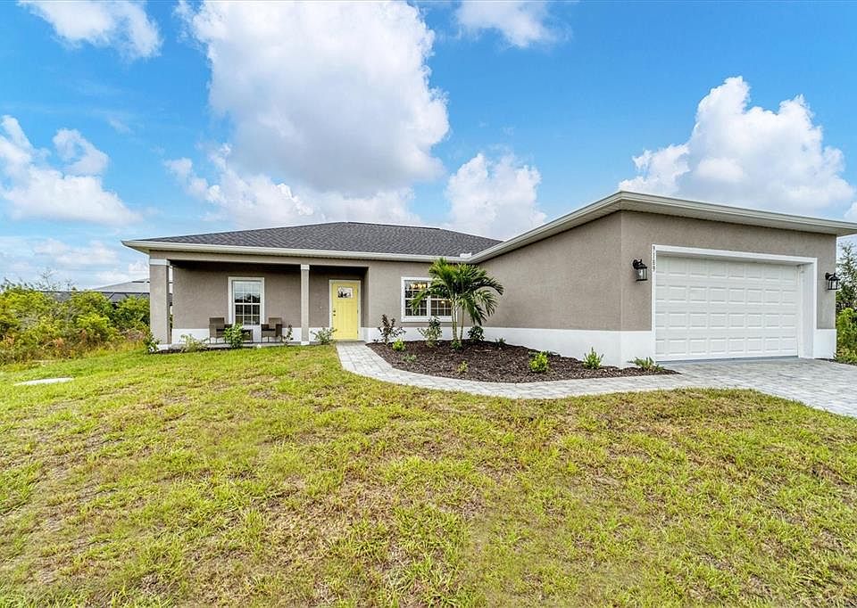 Under Construction. A Brand New Home with an Expected Completion Date of December 2023 can be Yours!! The modern color scheme and design of the exterior of the home, gray paver driveway, walkways and covered porch are showstoppers. Inside you will find this home has an abundance of updates and upgrades that include impact windows, easy care wood look tile flooring throughout, black door hardware throughout, prewired for a whole house generator, keyless entry door, designer black lighting fixtures in the living area and kitchen, energy efficient air conditioning and water heater systems, city water and sewer. The gourmet kitchen features white shaker style cabinets, quartz countertops, and a stainless steel appliance package. The ensuite primary bedroom has 2 walk-in closets, dual vanity, an oversized fully tiled walk-in shower. The two additional bedrooms both have double door reach-in closets, and the shared guest bathroom has a nice shower/tub combo and oversized vanity. Step through the sliding doors in the great room to a nice sized paver brick patio. This home is situated in the waterfront community of South Gulf Cove, where you can join the voluntary HOA for access to the community boat ramp, nature trails, a garden park, picnic pavilions, clubhouse, social activities and upgrades coming soon to include pickleball courts. The builder will provide a 2-10 home warranty and if you choose the builder’s preferred lender you will receive an additional $2,500 bonus towards lender credits. **NOTE: Photos are of the builder’s model home with the same layout and floor plan. Schedule your showing to see everything this home has to offer today.