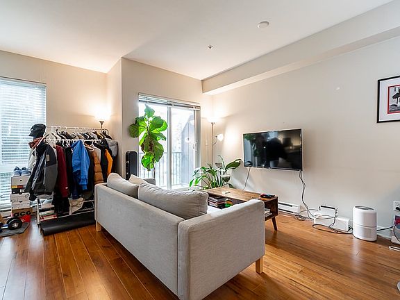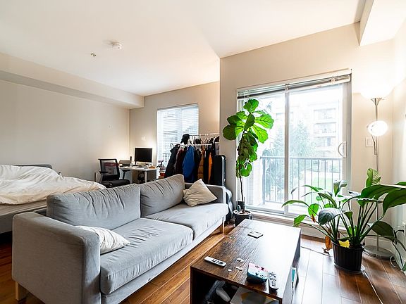 Welcome to the "ELEMENT"! This spacious, courtyard facing studio is SURE to impress! Featuring modern white counter tops, walnut cabinets with glass inserts, S/S appliances with built in microwave, under mount sink, walnut plank flooring and in suite laundry. This nice open & airy floorplan w/ large windows allows for TONS of natural light! Great location, walking distance to skytrain, SFU, recreation centre, shopping, pub, restaurants, park and more! This well-preserved, professionally managed building offers secure underground parking, clubhouse and an exercise centre. Great for students. 1 underground parking spot and storage locker included. Easily rentable - do not miss this great opportunity!