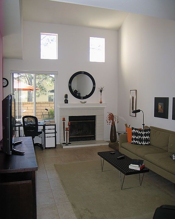Best location on south perimeter of complex above single family homes. Very private and quiet. Southern light pours through windows in living room, dining and kitchen. Fireplace. Large newer concrete patio with planter. Downstairs has neutral porcelain tile, upstairs neutral carpet. Newer dual pane windows, designer paint. Master has huge walk in closet, plus large mirrored wardrobe, vaulted ceiling. Attached 2 car garage. Walk to Town Center, Solana Highlands Elem school and park, TPHS. Easy and quick access to I-5 and beach.