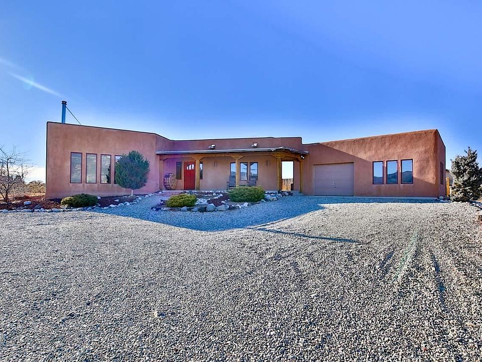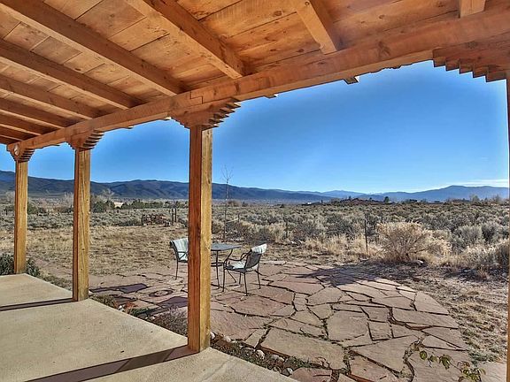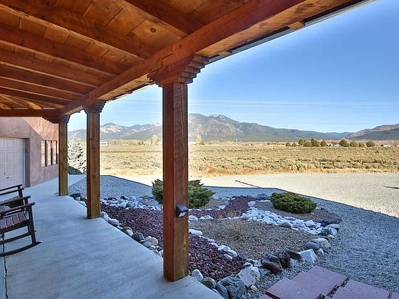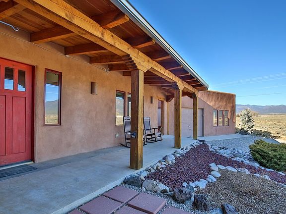 This home has spectacular, unobstructed views of the mountains to the East, through numerous living room windows. All bedrooms have outdoor access, and in good weather you enjoy the outdoors from lounging areas under covered portals, or walk your spacious 1 acre lot, which has landscaping consisting of trees, perennials, rock gardens and a rear play area. The Seller also installed flagstone walkways around the house and there is even a custom, hand made "Fort" for children that conveys with the home. You will have quick access to all major thoroughfares from Millicent Rogers Road; enabling easy travel to TSV, Taos, the Gorge and all points North. The home is well set back from the road, with a wide graveled drive and large parking area, in addition to a detached garage with an interior studio/office conversion. This 3 bedroom, 2 bath home has a central bonus room that can serve as a family playroom, or inside office. Additional features and maintenance indicate the Seller's pride of ownership. * Fiber optic broadband service (Kit Carson) to the house. * Routine maintenance performed (septic pumped in 2019 & 2021, roof inspected & serviced in 2020 & 2021, annual chimney sweeping) * Well pump replaced in 2020 The home also has a dedicated (not shared) Grandfathered 3 acre-ft domestic water well. * Stucco cosmetic cracks repaired in December 2021. * The adjacent property to the East is owned by Taos Pueblo, for protected mountain views far into the future.
