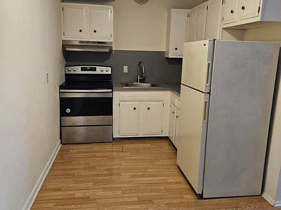 The unit offers a clean kitchen with modern white appliances. The kitchen includes a recently replaced stove, refrigerator, and range hood. These white appliances make the kitchen bright and clean. The bath is spotless and shiny.