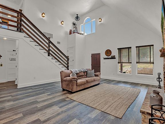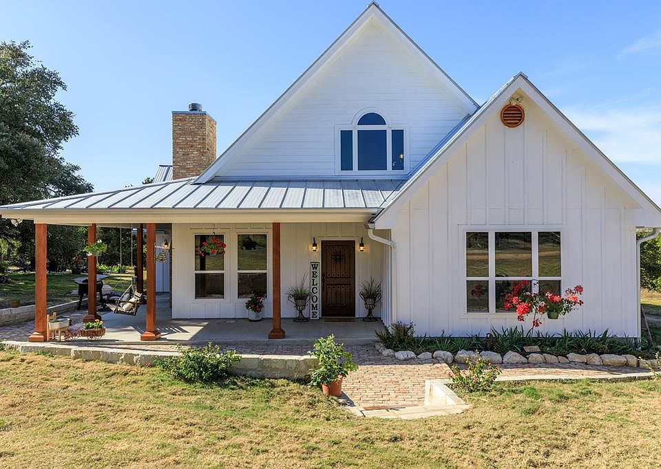 Heritage meets modern in this 1.5-story, farmhouse-style home on 12+/- ac conveniently located a short distance to Fredericksburg and nestled in the Texas Wine Country. Limited restrictions on the live oak strewn property allow for multiple uses. The 3-bed/3-bath home was designed with classic farmhouse features and outfitted with modern conveniences including open floor plan, cathedral ceilings and energy-efficient construction. The wood-burning fireplace, featuring Old Chicago-style brick, and wrap-around porch provide ample places to entertain, take in the scenery and enjoy the wildlife.