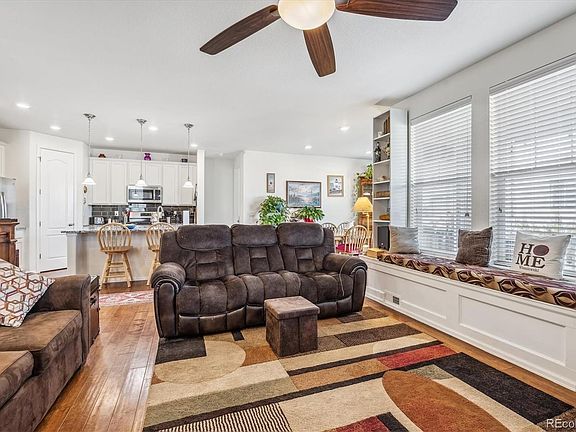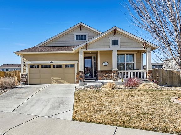 Gorgeous newer ranch-style home with a finished basement in Amber Creek! Oversized corner lot at the end of a cul-de-sac! Gleaming Woodhaven Banister Birch engineered hardwood flooring throughout the main level! Sunny, open floorplan concept with a large great room featuring a charming gas fireplace with marble surround! Perfect for gathering around on chilly Colorado evenings! The gourmet kitchen is open to the great room for ease of formal entertaining, and boasts white cabinetry, all stainless steel appliances, and granite countertops! A large island provide for extra food prep space and additional seating! The dining area overlooks the backyard deck with Pergola and gas firepit! Step outside for summer grilling with friends and family! The primary suite is separate from the other bedrooms and features a luxurious 5-piece bath and a large walk-in closet! Two secondary bedrooms share a full hall bath, and the laundry room is conveniently located on the main floor! The basement with 9-foot ceilings has been beautifully finished with a huge family room with bar area, and a 4th bedroom and bath - great for guests, in-laws, or could be used as a hobby or exercise room! Extra special features include sprinkler front and back, window treatments are included, a storage shed for tools, and garden boxes that are ready for your flowers in the Spring! Super location! Just a short walk to Amber Creek and Riverdale Parks, plus miles of walking/biking trails! Plenty of grocery stores and restaurants nearby, too! I-25 and E-470 are just minutes away! Don't miss out on this incredible opportunity in Amber Creek!