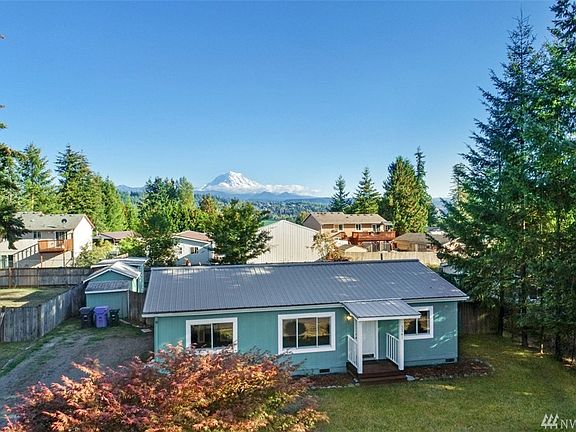 This charming home has beautiful view of Mount Rainier! 2 bedrooms plus den/office/craft room and two full baths. The spacious kitchen features skylights, vaulted ceilings, and lots of cupboard space. Large living/family room. Nice deck to large fully fenced backyard with garden space and with a little TLC the yard can look beautiful again! Two large storage sheds for tools and supplies. Community features include clubhouse and tennis courts. Sumner School District. Come see!