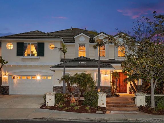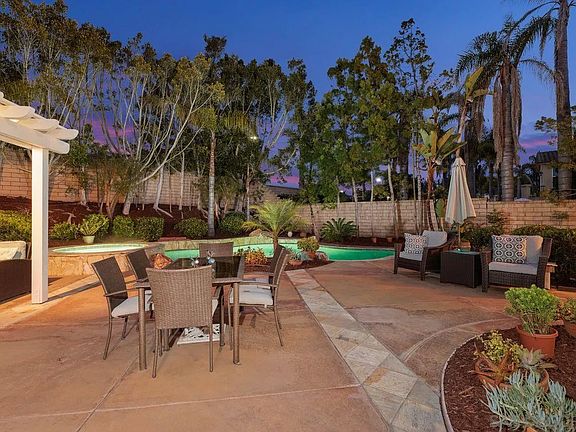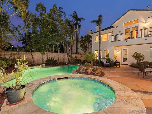 Nestled on a tranquil cul-de-sac, this exquisite Lexington Plan 3 home captivates with its lush landscaping and charming curb appeal. Step through impressive double front doors into a spacious, elegant interior featuring travertine flooring, soaring ceilings, and abundant natural light. The front of the home houses a built-in office with wood flooring and shelving, complete with an attached full bathroom. Beyond the winding staircase, a powder room leads to the expansive family room, where a gas fireplace offers cozy ambiance, and large windows provide views of the serene pool and garden. The family room flows seamlessly into the gourmet kitchen, which boasts GE Monogram and GE Profile appliances, Instant-hot tap, a walk-in pantry, white cabinetry, granite countertops, and an inviting dining nook. The backyard is a true oasis, featuring a built-in BBQ, covered patio, pool, spa, and ample hardscaping with multiple gathering areas. The main level also includes a guest bedroom with an ensuite bath, an office with a built-in desk and ensuite bath, and a central laundry room with built-in cabinets and a utility sink. Upstairs, the primary suite is a sanctuary, offering a spacious sitting area with a fireplace and media niche, a private balcony, two walk-in closets, and a luxurious bathroom with a soaking tub, dual sinks, a vanity, a large step-in shower, and a water closet. Three additional bedrooms and a flex space with Jack & Jill bathrooms complete the upper level. The flex space, typically used as a den or theater room, provides versatile living options.