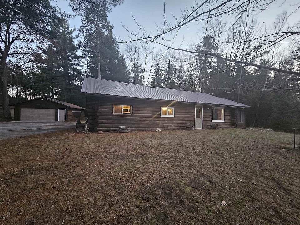 Country living amongst wildlife in this 3-bedroom, 2-bathroom log cabin retreat nestled on nearly 7 wooded acres. Surrounded by the beauty of nature, this home offers easy access to UTV/ATV, hiking, cross-country skiing, and snowmobile trails as well as golf courses & lakes w/public access. Inside, enjoy the views of the spring-fed pond from the kitchen, or while relaxing in the living room. Cozy up to the field-stone wood fireplace. The single-level retreat boasts three bedrooms, with a spacious master bedroom featuring a full bath suite with a walk-in tile shower. Enjoy the convenience of no stairs and the durability of a metal roof. Stay cozy with three heating sources. Yr Built est.