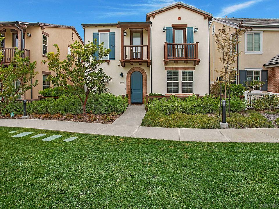 Gorgeous Carmel Valley home with plenty of charm! The curb appeal speaks for itself with two balconies, vintage-style shutters & brick accents. The open floor plan features cool wood-style laminate floor, high ceilings and plenty of natural light. Gourmet kitchen w/center island, gas cooktop and granite counter tops. All bedrooms upstairs with laundry area, office nook, luxury bathrooms and ample storage. Enjoy a private flagstone patio with room for garden and a large grassy area just across the street.